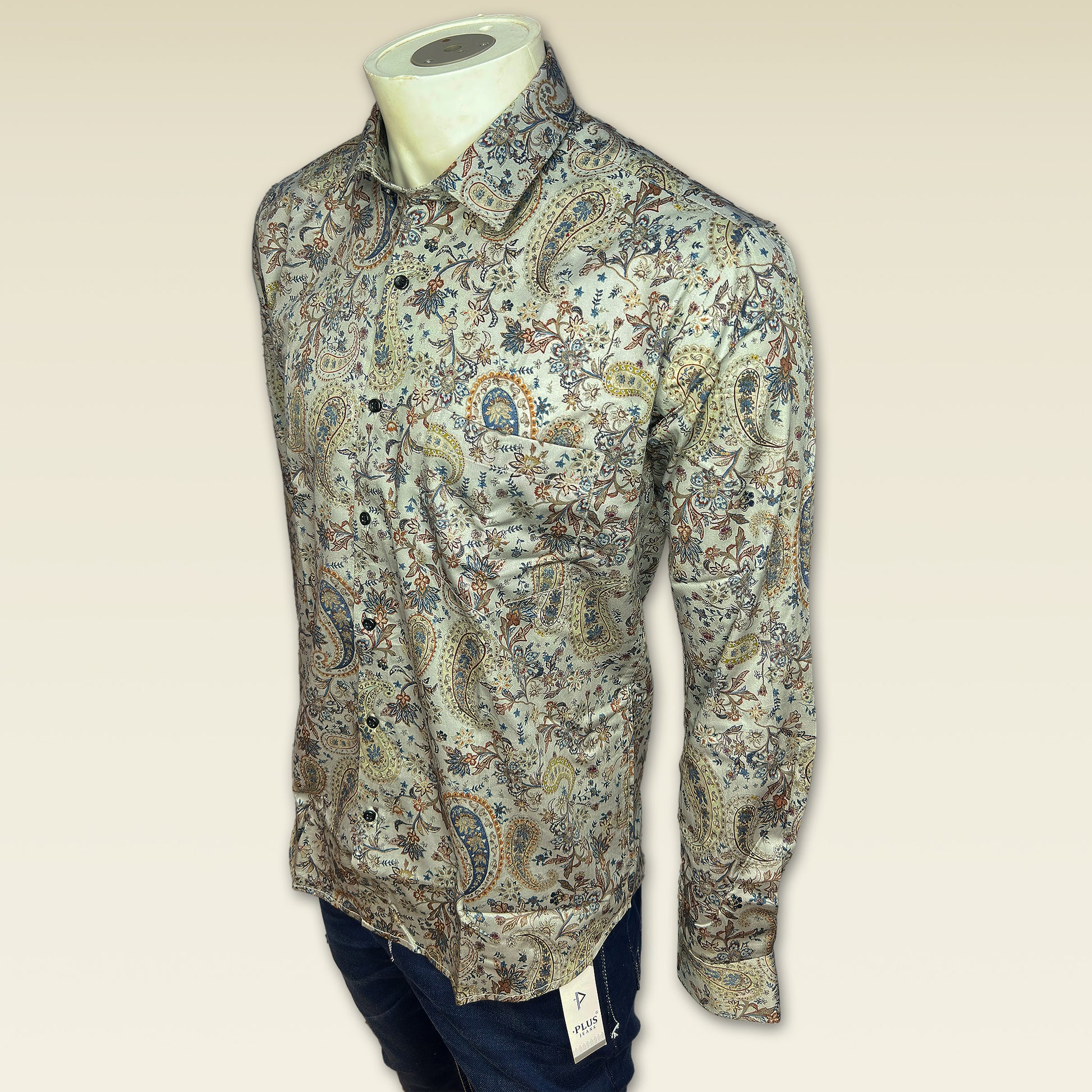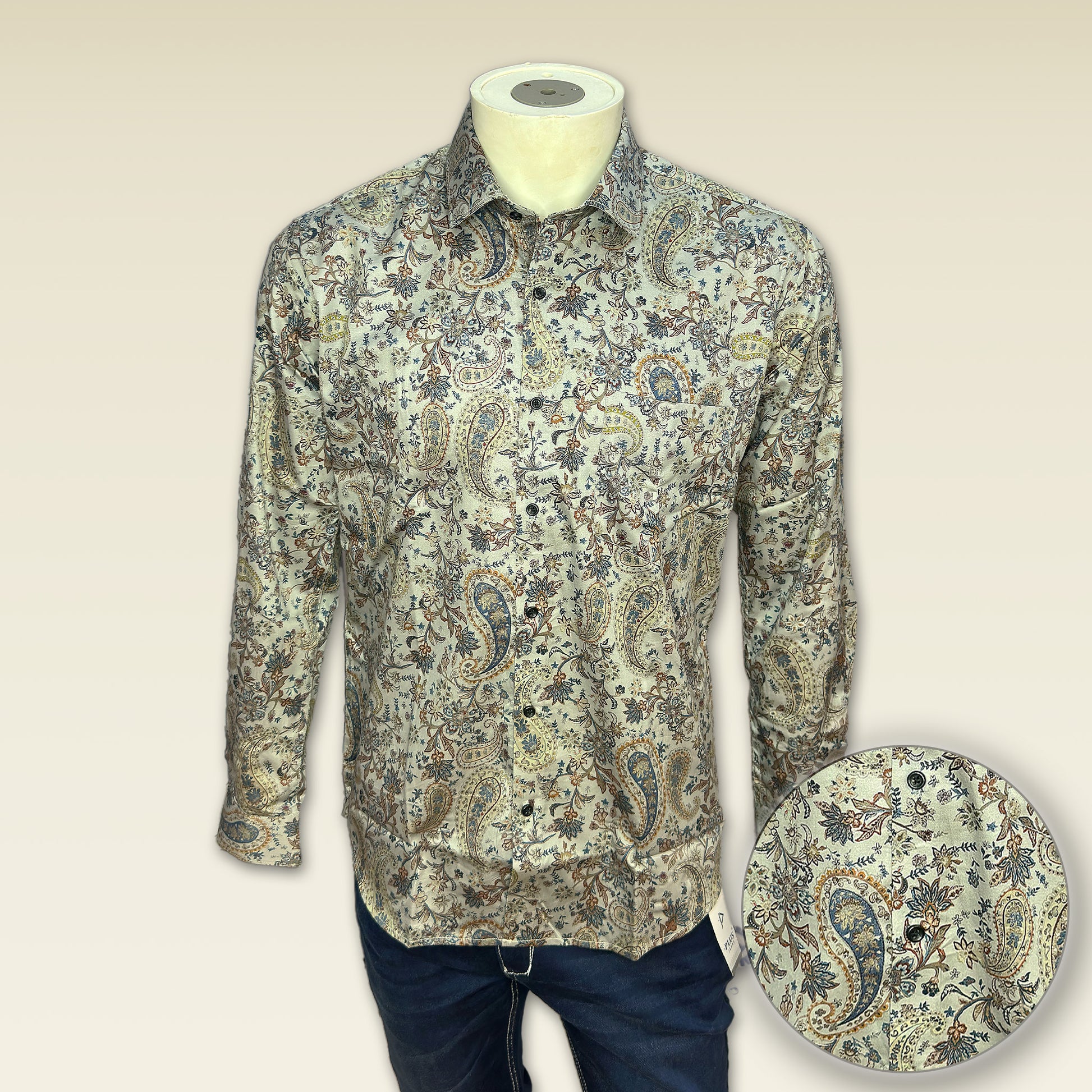 या कालातीत बेज पेस्ले प्रिंट शर्टने तुमचा वॉर्डरोब उंच करा. क्लिष्ट पेस्ली आकृतिबंध आणि मातीच्या टोनसह डिझाइन केलेले, हा शर्ट प्रासंगिक आणि औपचारिक दोन्ही प्रसंगांसाठी योग्य आहे. प्रीमियम फॅब्रिकसह बनविलेले, ते आराम आणि टिकाऊपणा सुनिश्चित करते. परिष्कृतता आणि मोहकता वाढवणाऱ्या सहज लुकसाठी क्लासिक चिनोज किंवा डेनिमसह ते जोडा.