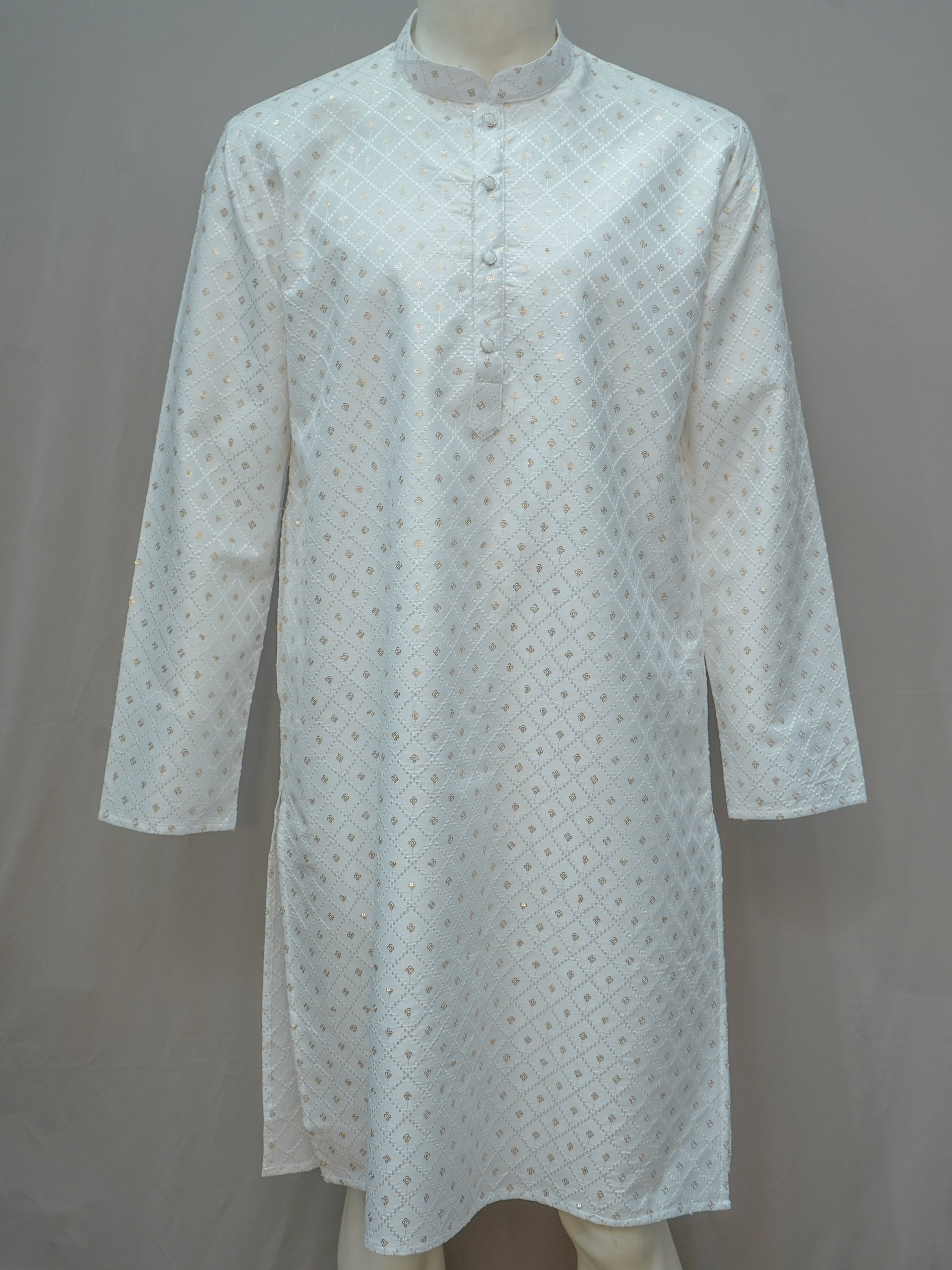 This Men's Pearl White Kurta, adorned with delicate golden embroidery, is a timeless piece for every festive wardrobe. The serene pearl white hue adds a touch of grace, while the intricate detailing showcases fine craftsmanship. Made with premium-quality fabric, it ensures comfort and elegance, making it ideal for weddings, festive occasions, and traditional gatherings. Pair it with beige or gold bottoms for an effortlessly sophisticated look.